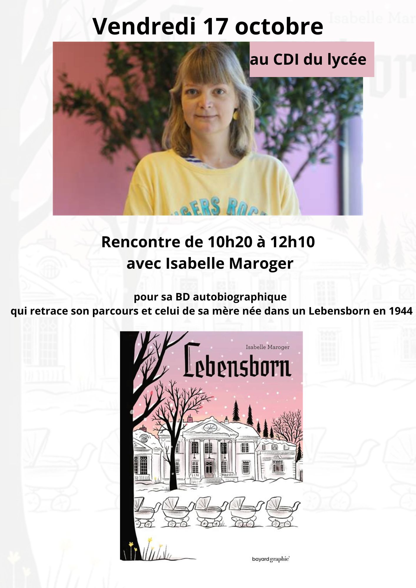L'autrice présentera sa BD qui retrace son parcours et celui de sa mère, née dans un Lebensborn en Norvège en 1944. Un Lebensborn était un lieu où on faisait naître des enfants "aryens" pour promouvoir cette "race" de gens blonds aux yeux bleux.