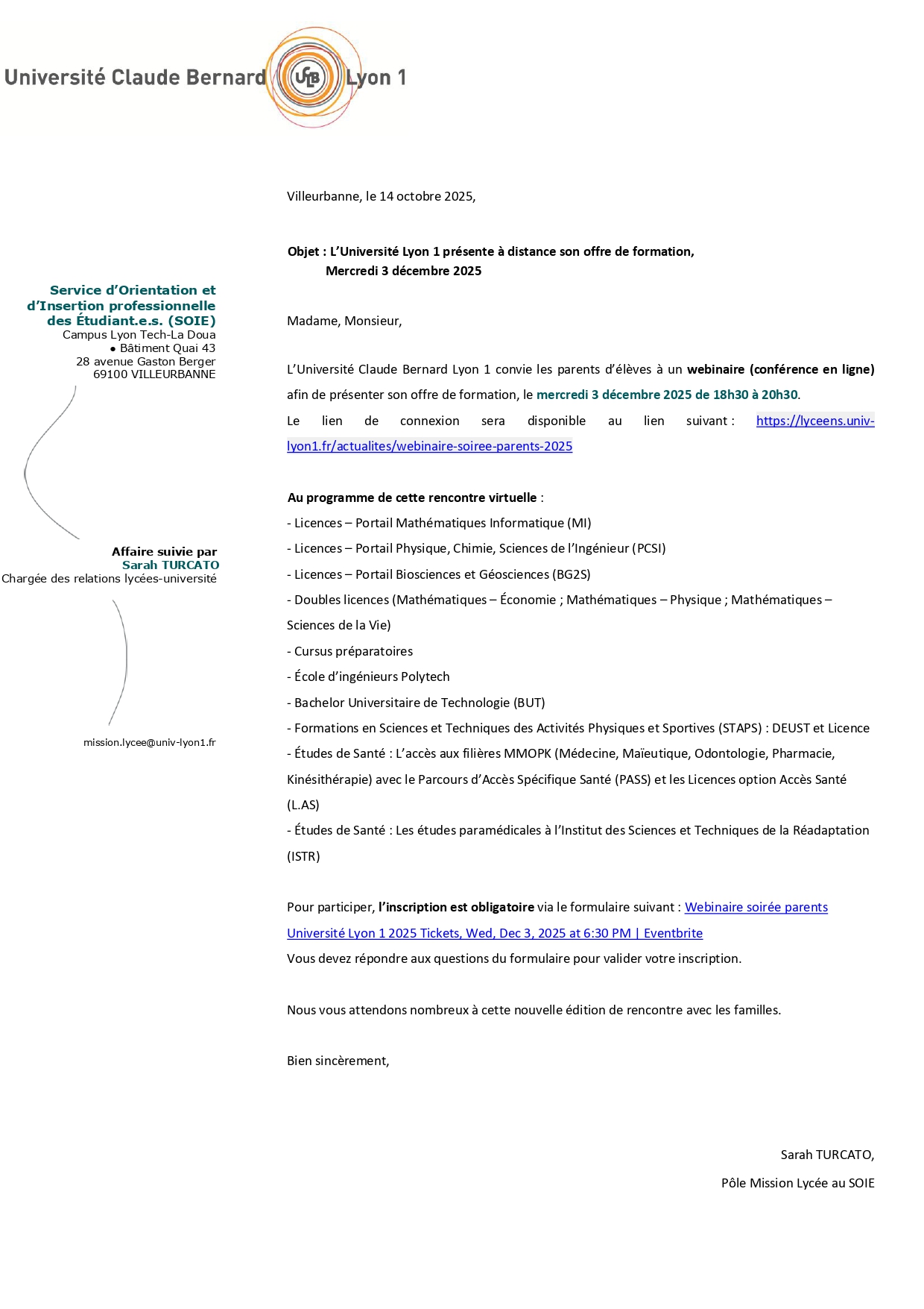 L’Université Claude Bernard Lyon 1 convie les parents d’élèves à un webinaire (conférence en ligne) afin de présenter son offre de formation, le mercredi 3 décembre 2025 de 18h30 à 20h30. Le lien sera disponible sur inscription.