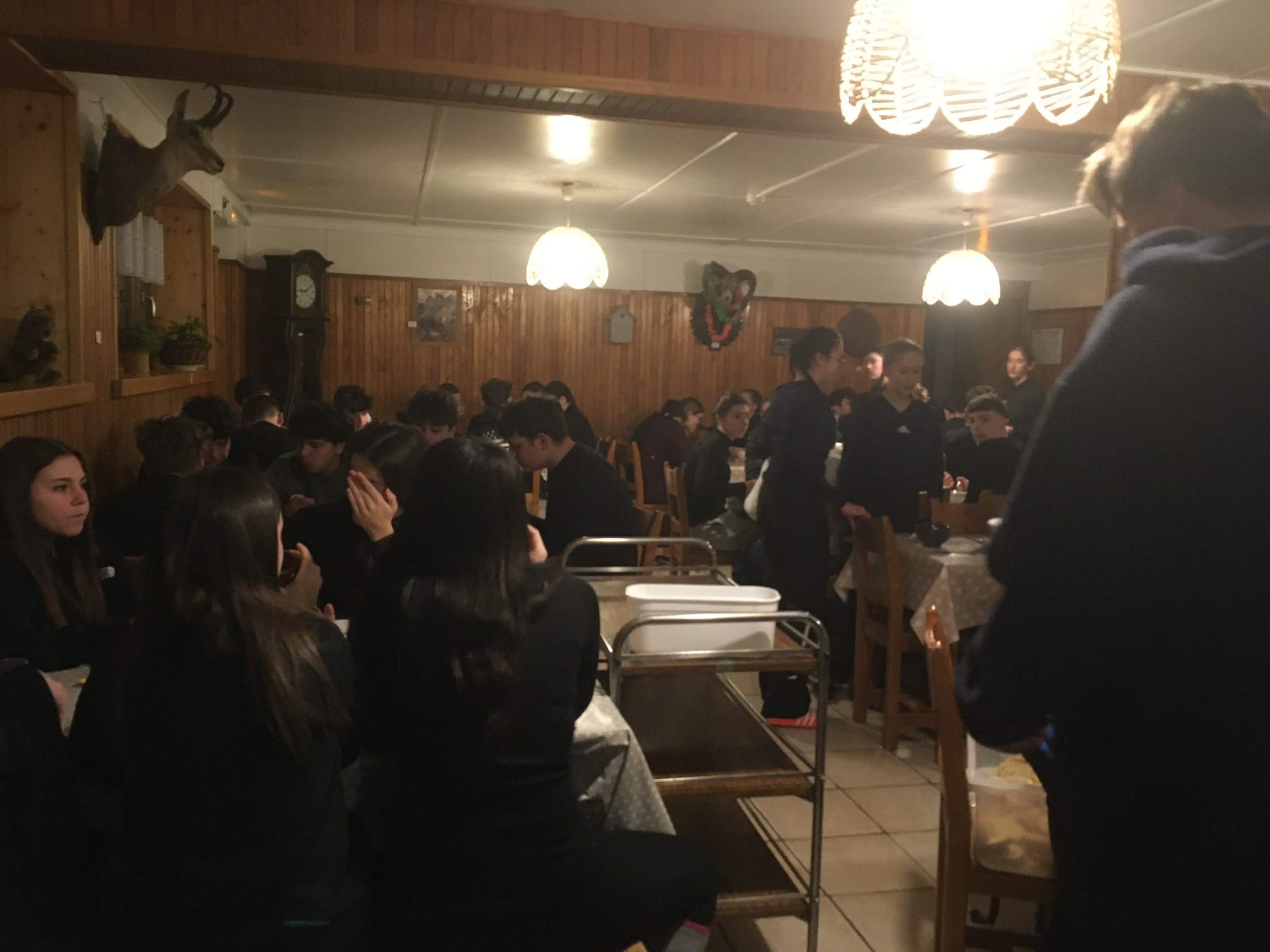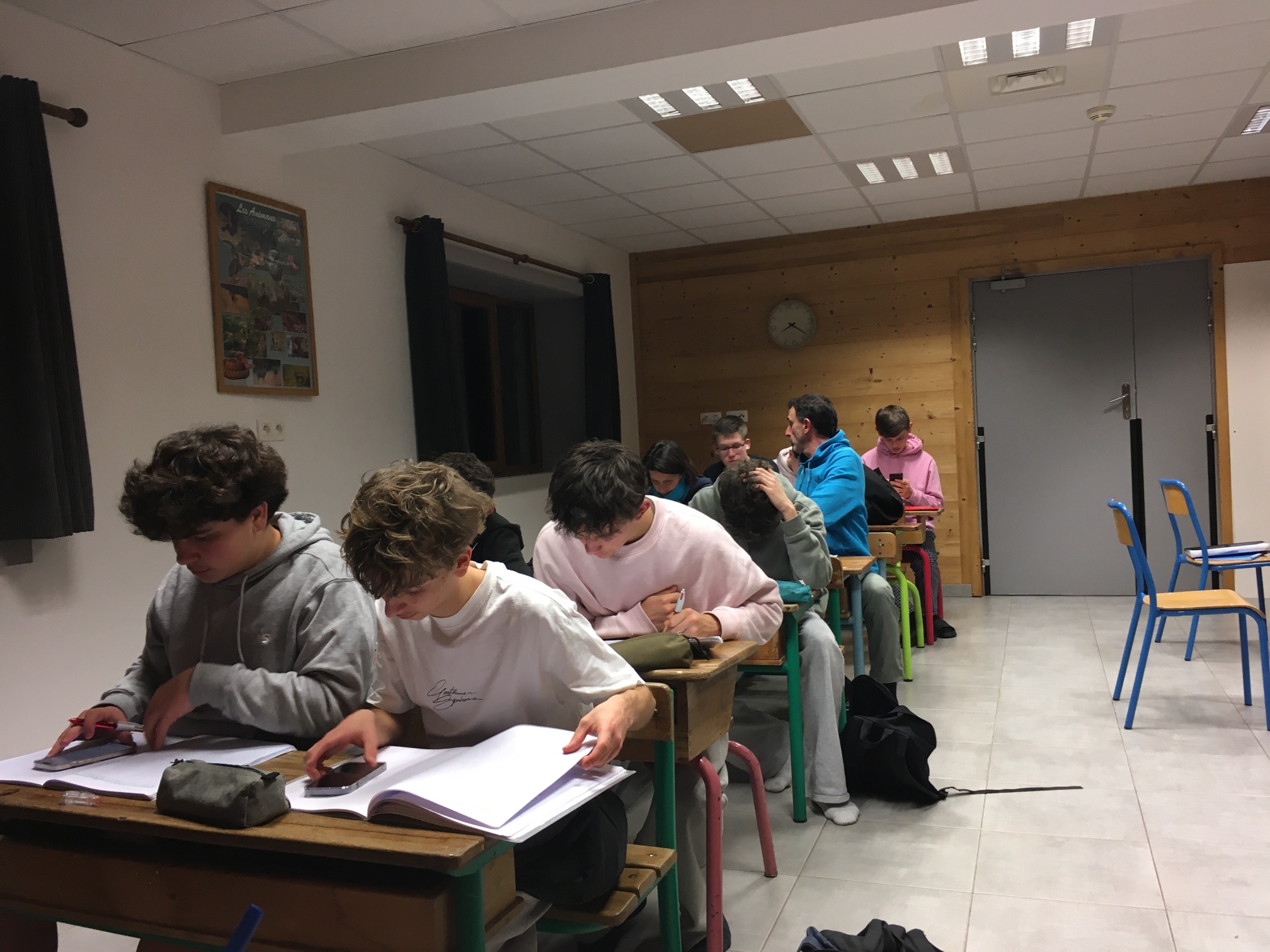 Retour donc sur les pistes pour l'après-midi avant un goûter au chalet, session de douches et temps calme, puis repas à 19h (soupe, riz aux petits pois et poulet et yaourt) avant un moment d'étude obligatoire pour tous les participants, pour rattraper une partie des cours qui se poursuivent au lycée.